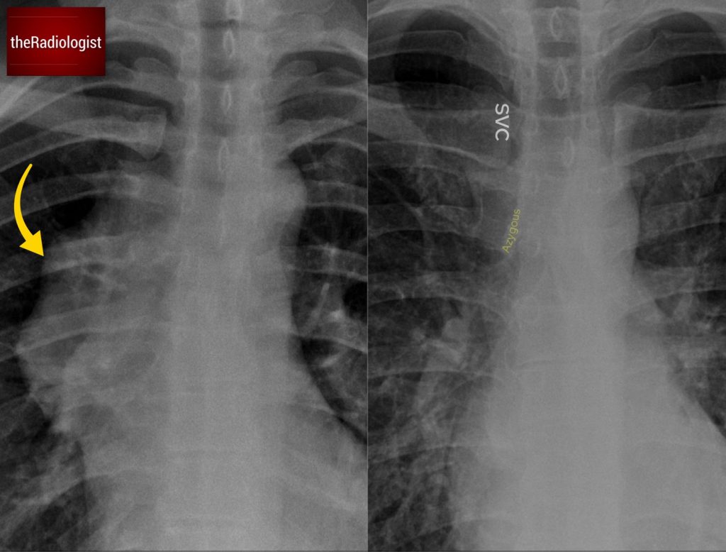 Compare the normal anatomy (right) with our case (left). In normal circumstances we should be able to see a faint opacity reflecting the SVC and brachiocephalic veins as well as an azygos contour. In our case these are more difficult to spot with an abnormal contour to the right side of the mediastinum.