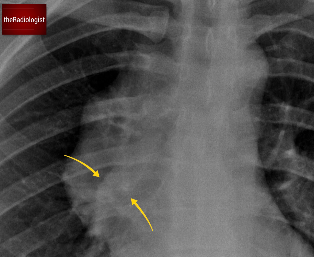 In this case, those normal contours are missing. Instead, we see an abnormal contour along the right side of the mediastinum.
