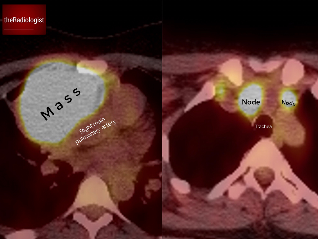 FDG PET-CT shows intense avidity within the lesion and a small number of lymph nodes within the mediastinum.
