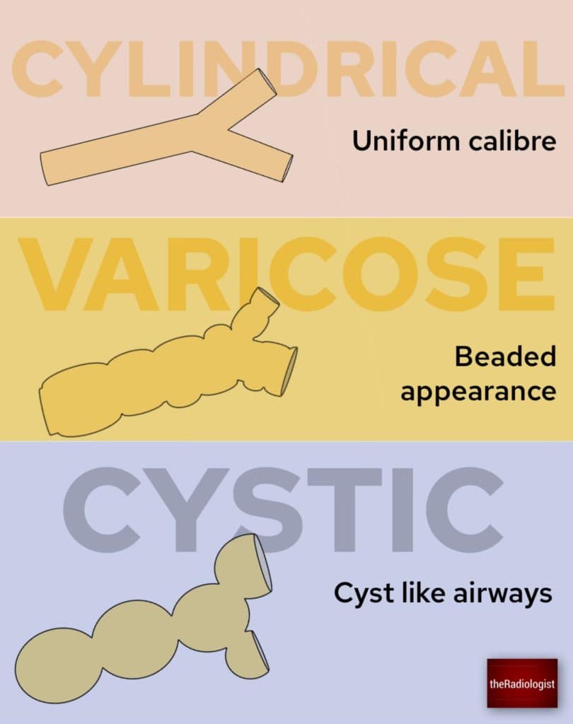 We can think of bronchiectasis as a spectrum of cylindrical, varicose and cystic bronchiectasis.