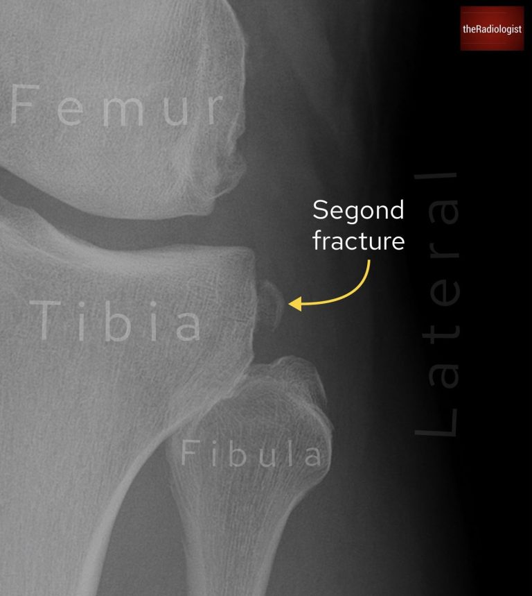 A Segond fracture is another sign of an ACL injury, here you are looking for a bone fragment lateral to the lateral tibial plateau, above the fibula head and just below the joint line.