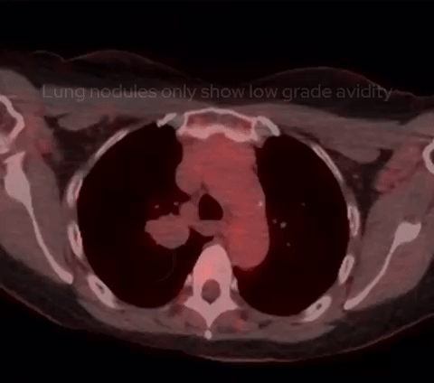 Next came a PET-CT scan. While the lung nodules showed only mild FDG avidity, areas within both breasts exhibited more significant avidity. This prompted a referral to the breast unit for further investigation. The breast lesions turned out to be benign papillomas, unrelated to the lung nodules.