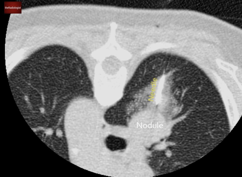 CT guided biopsy of a large right sided lung nodule was performed to obtain a tissue diagnosis of benign metastasising leiomyomas.