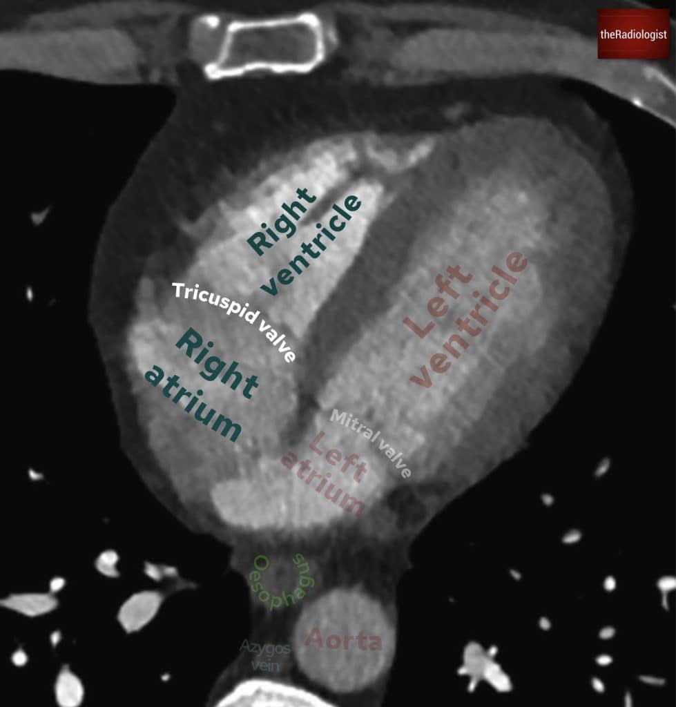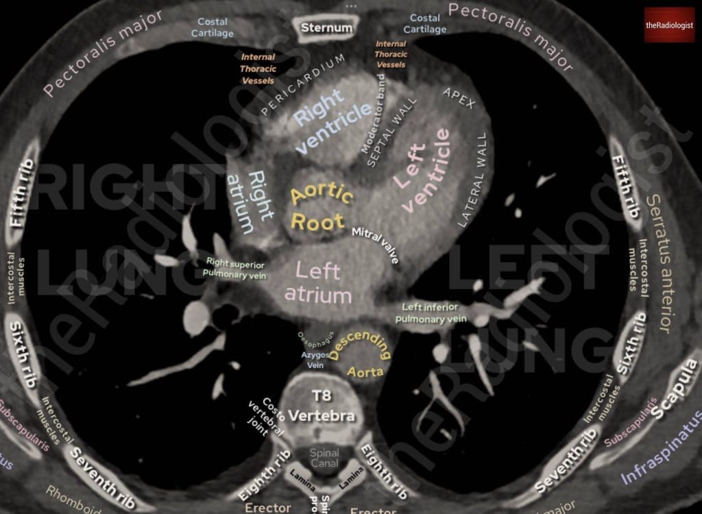 Annotated view of a CT chest showing the pulmonary veins draining into the left atrium.