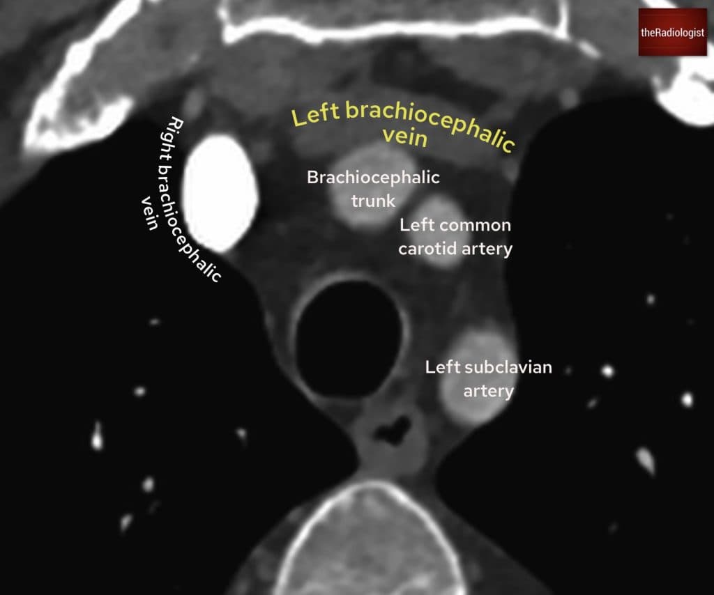 Here we see the left and right brachiocephalic veins at the level of the branches of the arch of aorta.