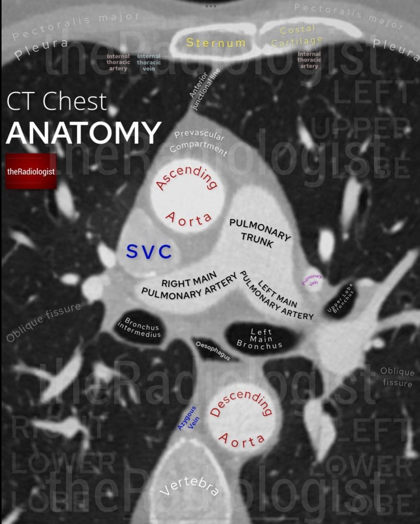 Now let’s have a look at the scan and examine some anatomy. In every CT scan I review, I follow the contrast from where it was injected all the way into the heart and beyond. This ensures that I don’t miss anything along the way and also helps me identify pulmonary embolism (PE) on scans when we weren’t specifically looking for it (missing a PE is something you don’t want to do at any time as it can be a life threatening diagnosis).