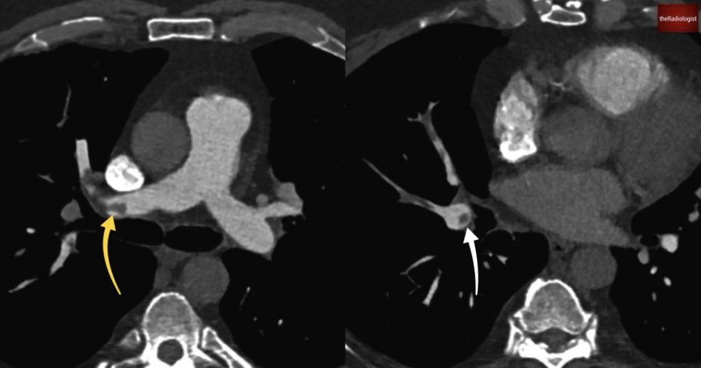 We can see in our case there are filling defects within the pulmonary arteries. On the left image there is a filling defect within the right main pulmonary artery (yellow arrow). Going into the right lower lobe on the right hand image we can see a ‘polo sign’ (white arrow) suggesting the pulmonary emboli are acute.