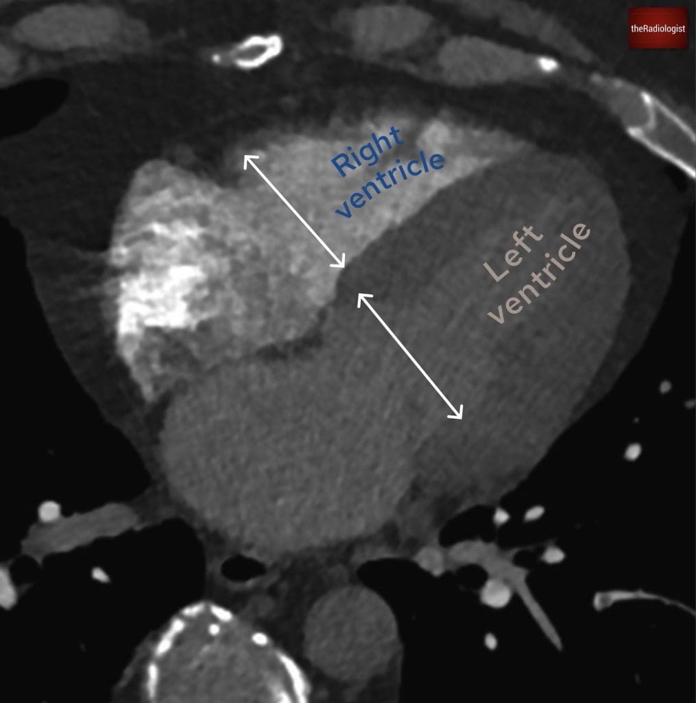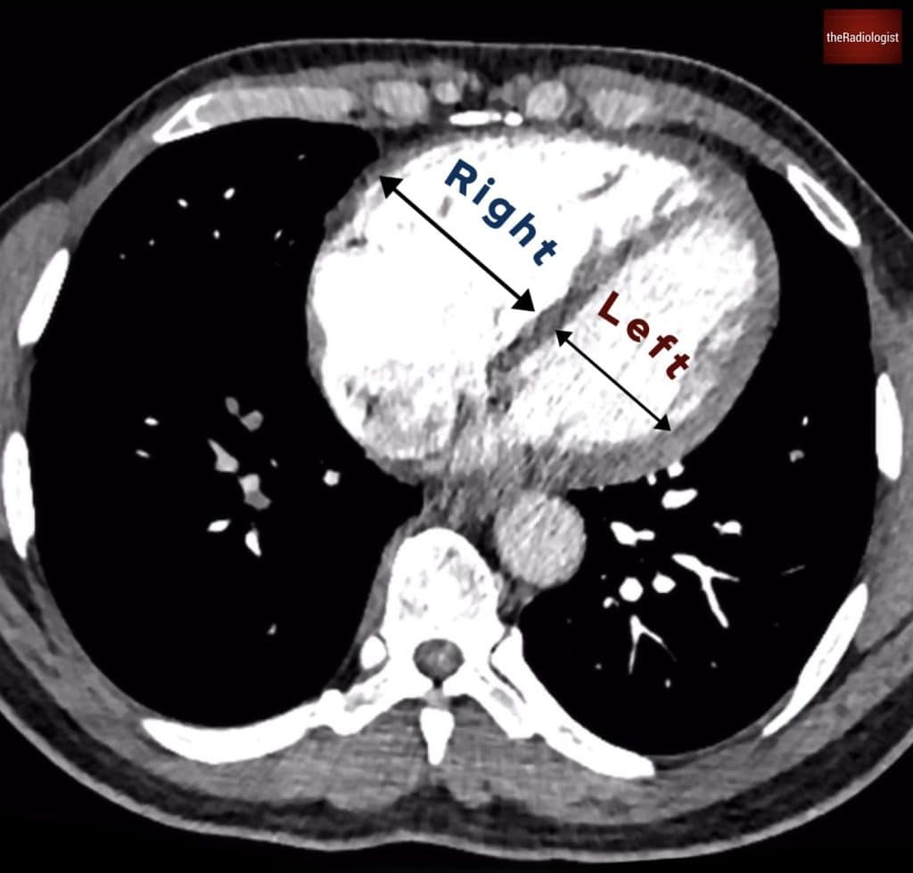 This is the key finding and what correlates better with Echo findings and morbity/mortality than signs like septal bowing or reflux of contrast which I like to consider signs that can support a diagnosis of right heart strain on CT. An RV/LV axial dimension ratio of >1 is abnormal and usually can be attributed to the current episode but worth bearing in mind: