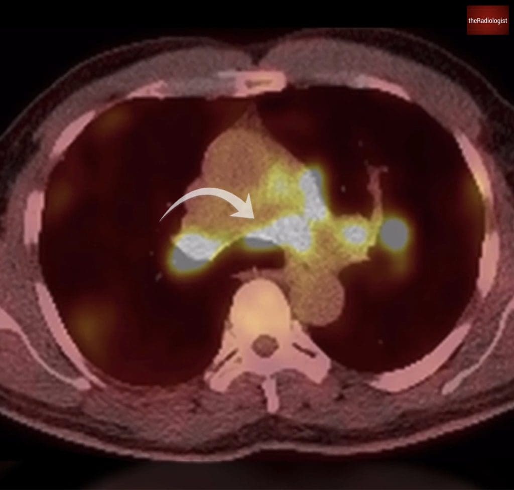 A subsequent PET-CT added a surprising layer: not only were some of the lung nodules FDG-avid, but the pulmonary artery filling defects themselves were also avid, something we wouldn’t expect in typical thromboembolic disease. Normally, thrombus is non-avid on PET imaging.