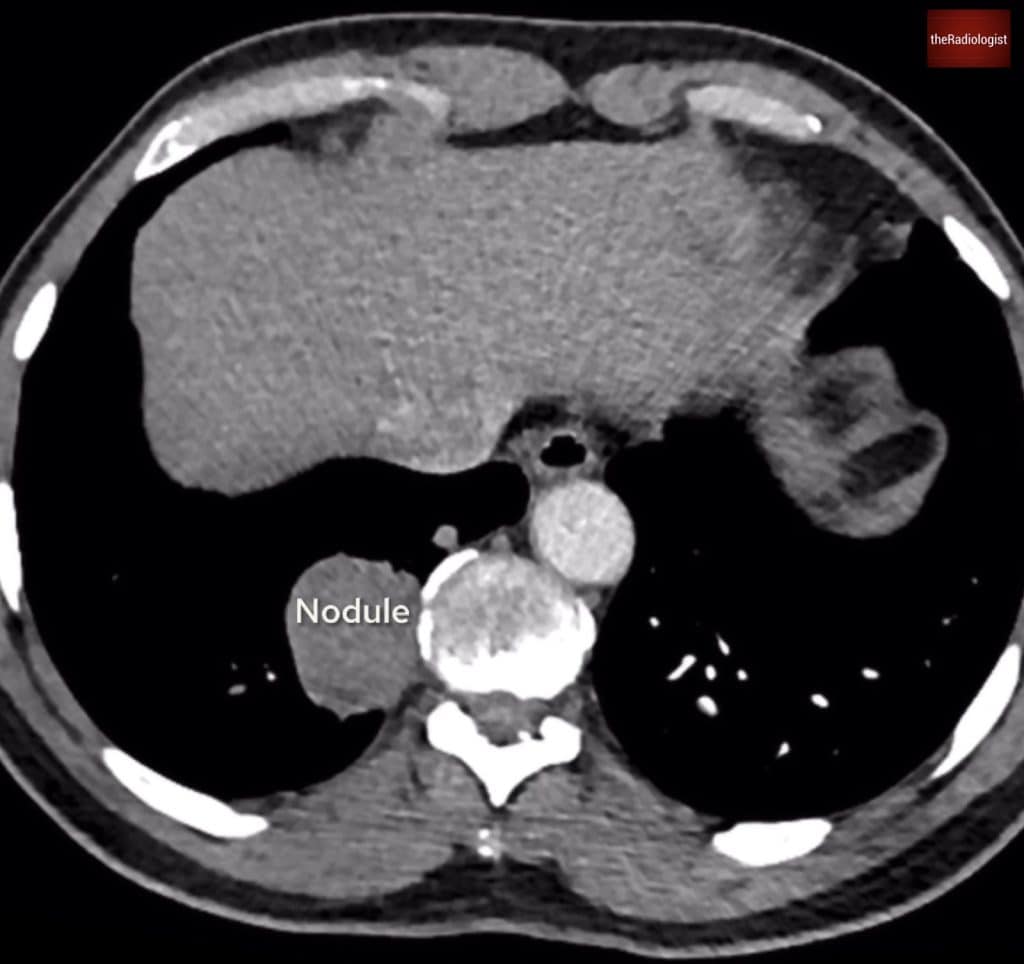 Have a look at lung windows and there are multiple pulmonary nodules, the largest located in the right lower lobe. The upper abdominal cuts were unremarkable, but the presence of multiple nodules raise concern for metastatic disease.