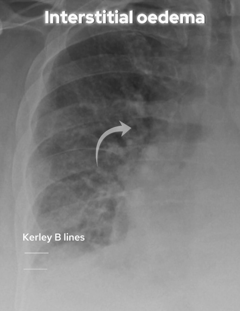 - Kerley B lines, horizontal lines at the lung bases, indicate interstitial thickening.