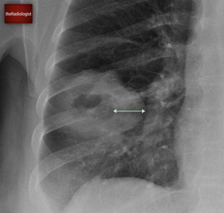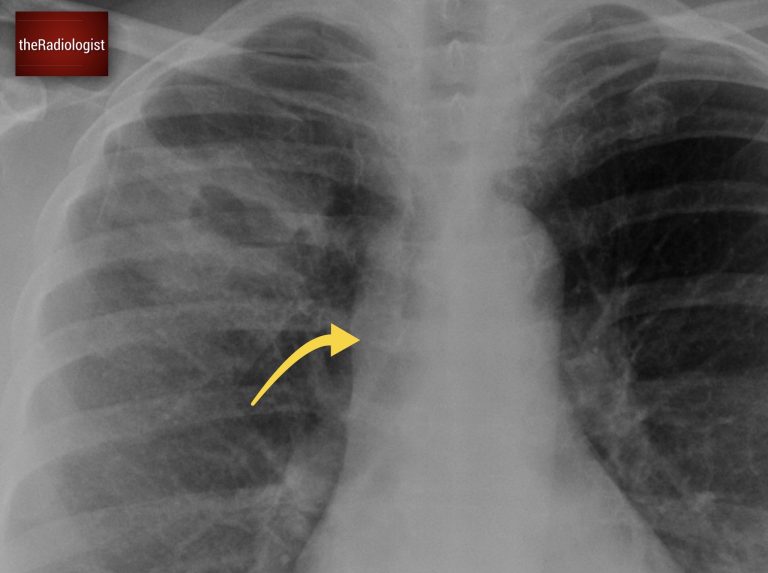 Have another look at the cavitating lesion. In this case, the lesion’s thick walls were a red flag, pointing towards malignancy. But this on its own wasn’t enough to confirm the diagnosis. There is however another sign on the film that is more specific.
