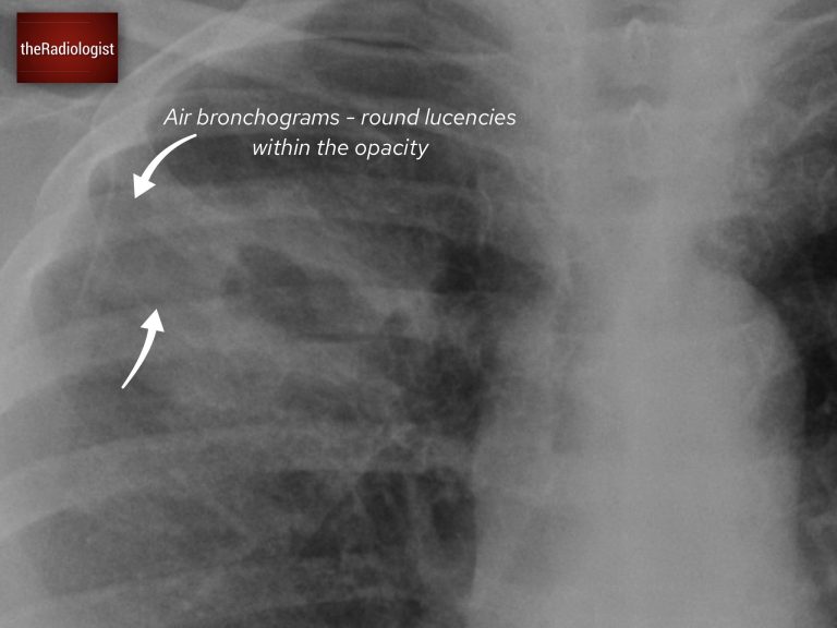 The X-ray revealed a cavitating lesion surrounded by consolidation. How do we know this is consolidation? Look for air bronchograms: small, round lucencies within the opacity, a hallmark of consolidation.