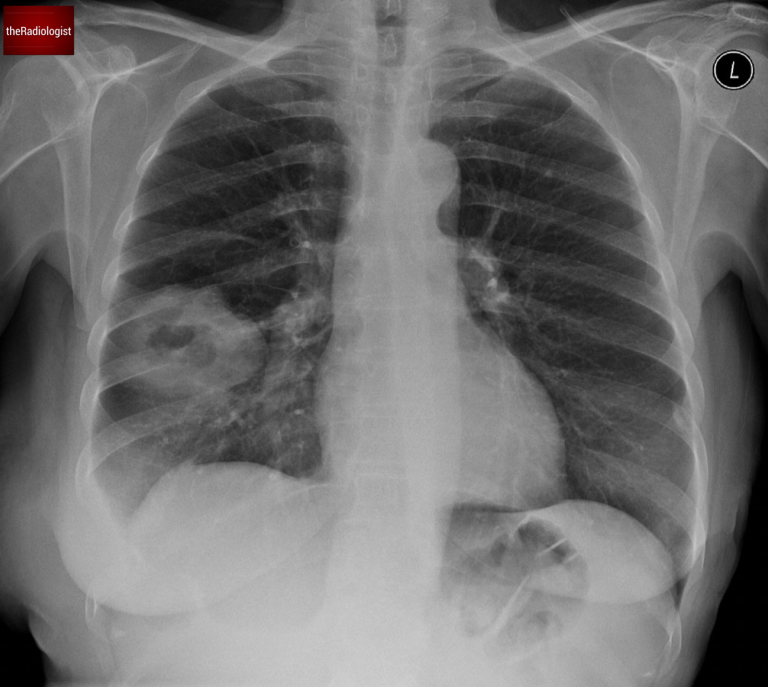 A single cavitating lesion does not always mean lung cancer. In a separate case, a female patient in her 60s presented with a history of cough and fever, along with imaging that showed a cavitating lesion in the right lung. Have a look at the X-Ray below: