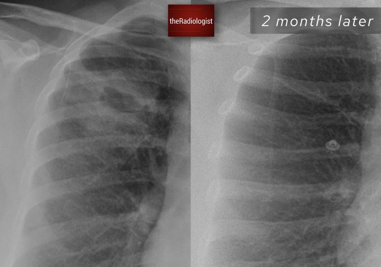 Follow up chest X-Ray at 2 months shows resolution of the right sided cavitating lesion.