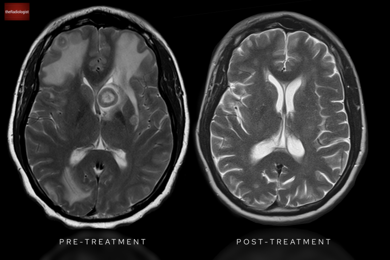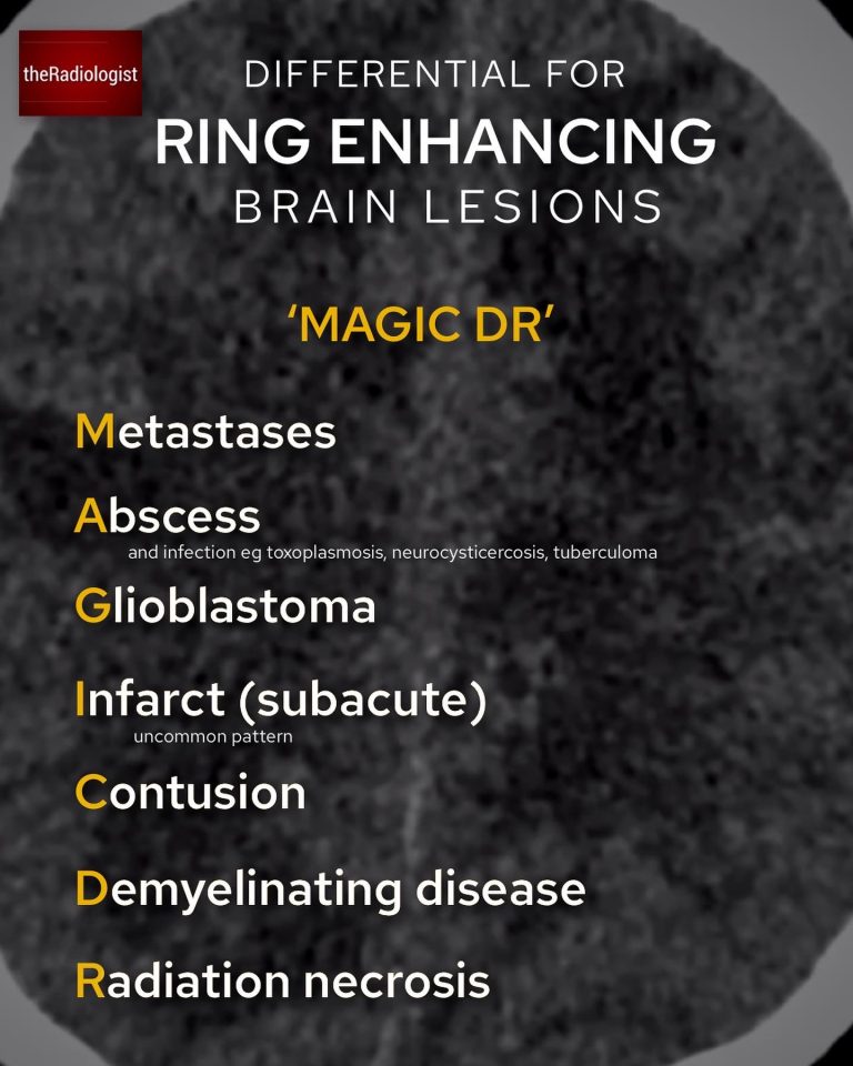 Returning to our case, the administration of IV contrast highlights multiple ring enhancing lesions distributed throughout the brain. These ring-enhancing lesions have a differential diagnosis, famously known as ‘MAGIC DR’.