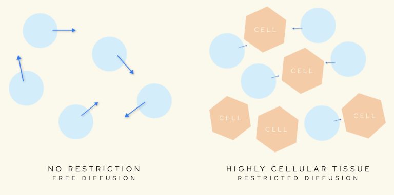 In cases of highly cellular tissue, water molecules are ‘restricted’ – the basis of diffusion-weighed imaging (DWI).